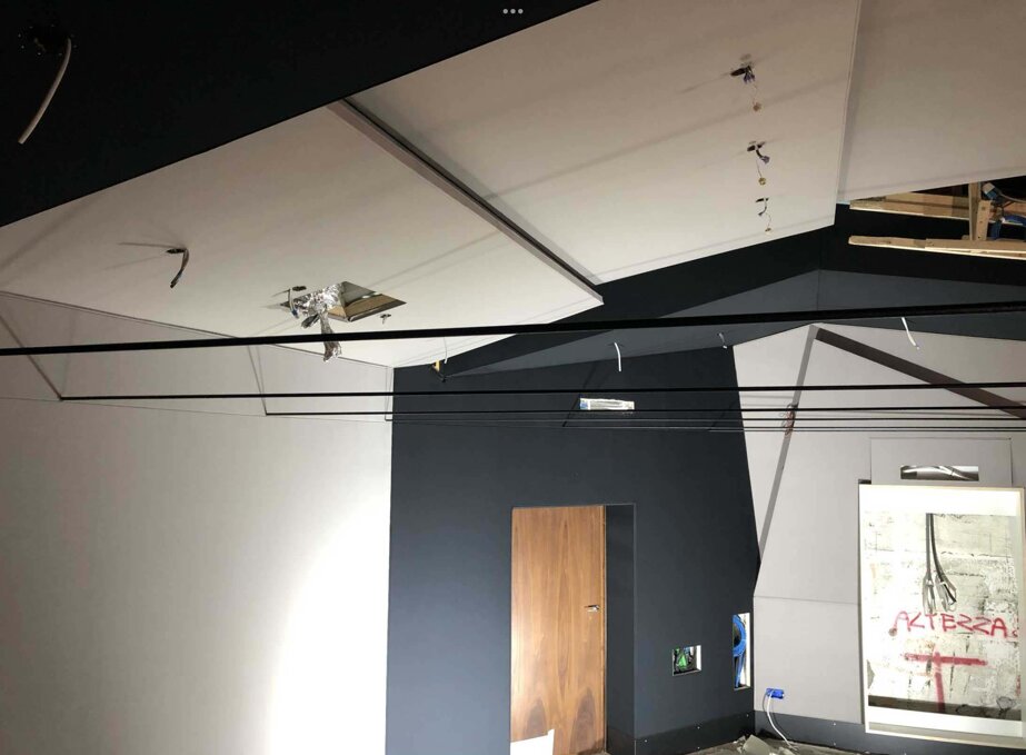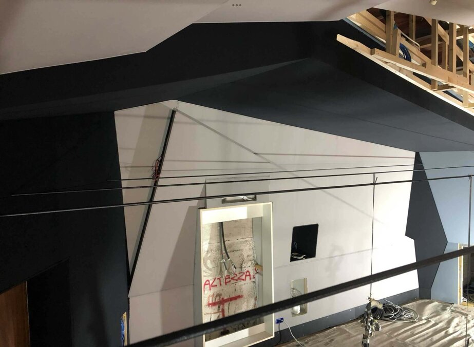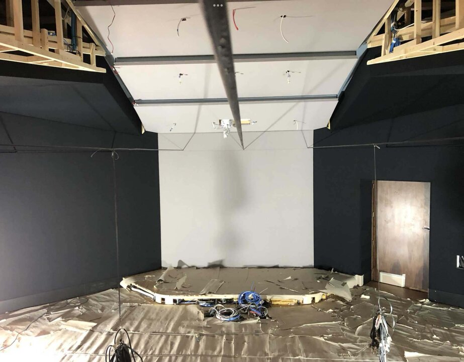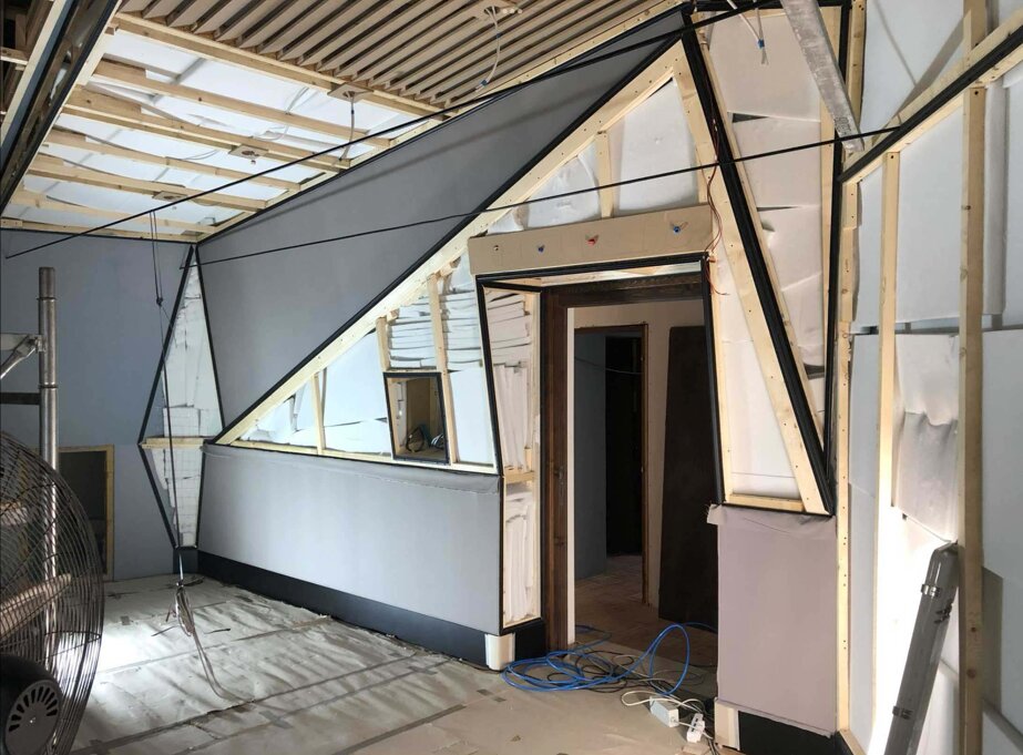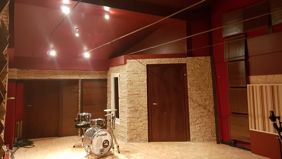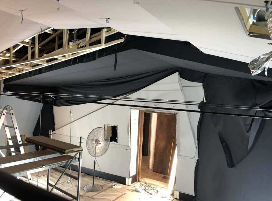 La trasformazione con tessuti tecnici per coprire la struttura portante di un complesso sistema di fonoassorbenza appositamente realizzato per lo studio di registrazione.